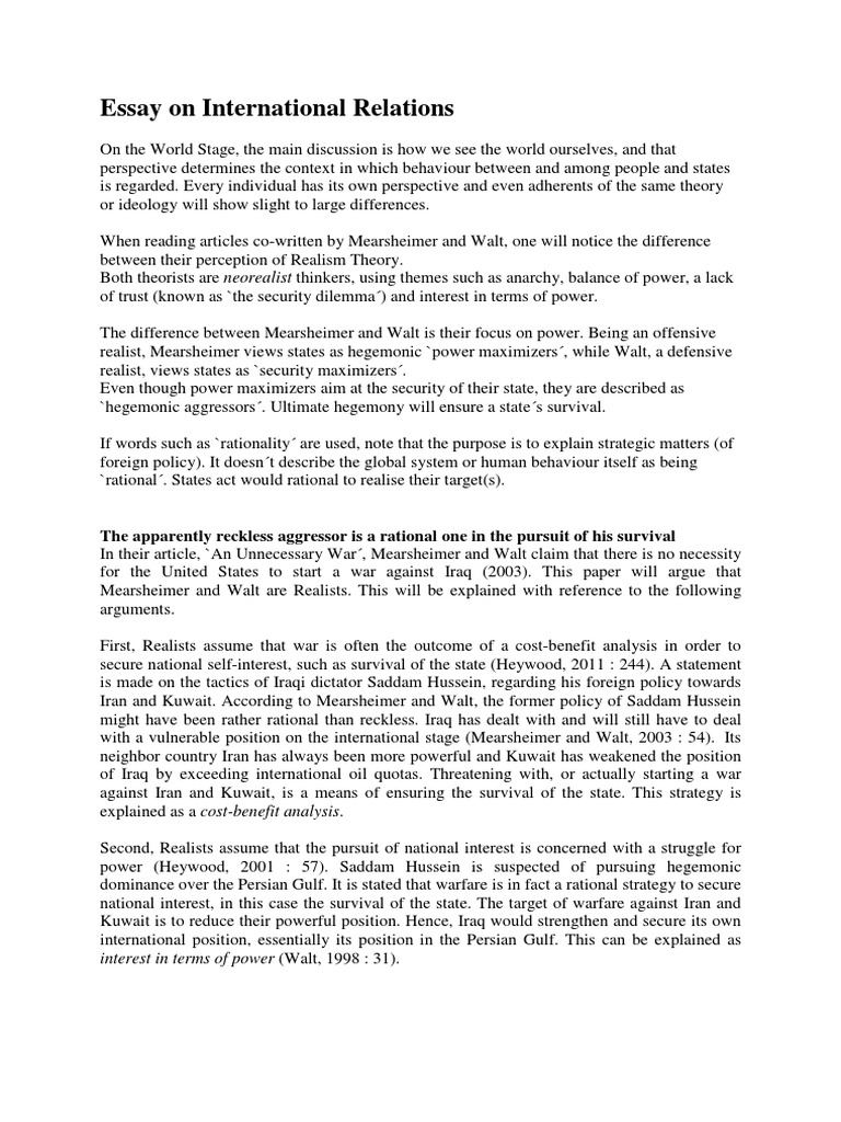Essay On International Relations Words | 4 Pages. about the history of International Relations (IR) and United Nation (UN) Organization as well as the role of UN in international relation with the world government Sample international relations Essay Questions. Below is a list of sample essay questions in the subject of International Relations. View our Essay Writing Service. Very informative and detailed critical essay plans, one for each topic. Currently the issue of good governance is widely regarded as one of the key ingredients for poverty reduction and sustainable development INTERNATIONAL RELATIONS THEORY Why do states behave the way they do in the international system? Some people argue that this is a question of international relations theory while others say it is a question of foreign policy theory[1]. political or economic factors" Justice in International Relations Introduction This essay raises the